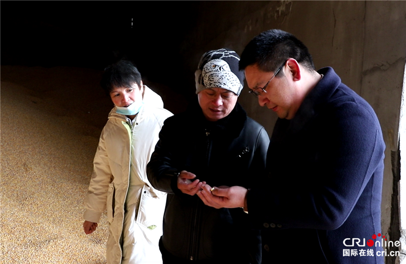 饶河县泰昌粮食收储有限公司总经理张志国(中)为饶河农商银行工作人员介绍粮食收储情况
